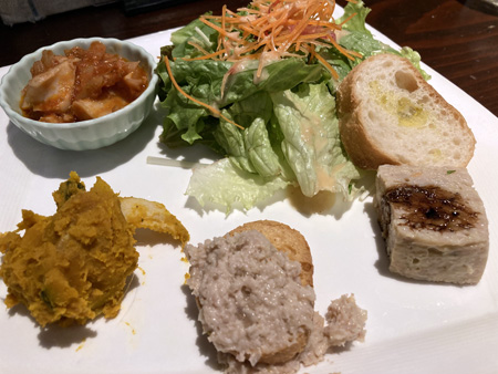 内容は、4種類の前菜とフレッシュグリーンサラダのプレートに、カップスープ、パスタorピッツァ、そしてドリンクが付きます。