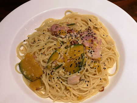 今回はパスタの「ベーコンとカボチャのペペロンチーノ」を注文しました。